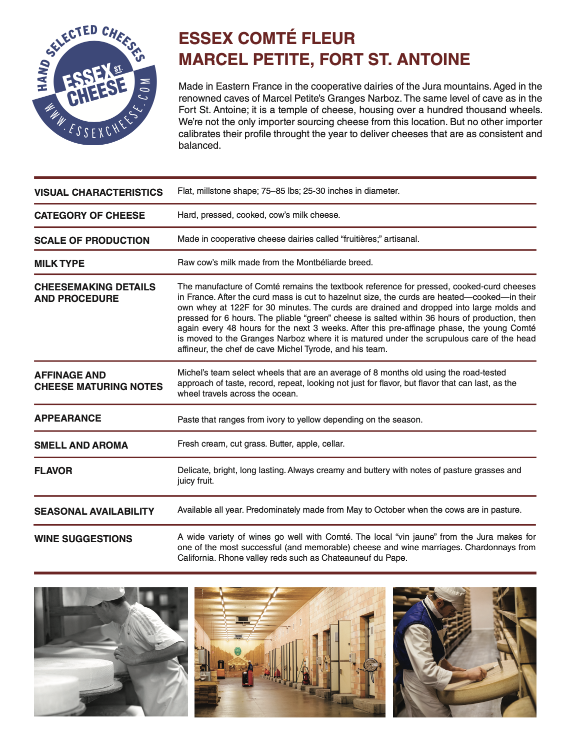 Deep details on Gourmet Imports Reservation Comté from Marcel Petite, Fort St. Antoine. 8.5 x 11 inch PDF to download and print for training and reference.